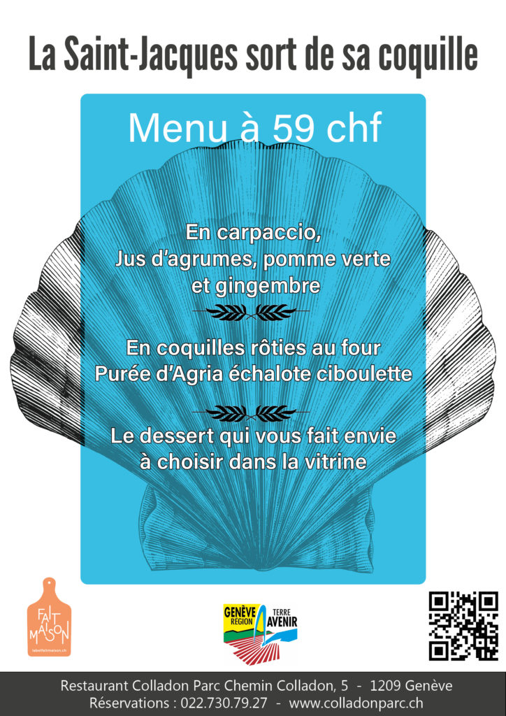Le chef Christophe Hubert vous propose un menu inspiré par le produit star de la saison, la coquille Saint-Jacques. Pour CHF 59.- vous pourrez déguster ce délicieux coquillage en carpaccio, jus d’agrumes, pomme verte et gingembre. Pour le plat principal, vous les retrouverez en coquilles rôties au four accompagnées d’une purée d’Agria, échalote et ciboulette. Pour le dessert pas de Saint-Jacques, mais le choix d’un dessert qui vous fait envie dans la vitrine.